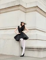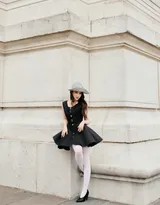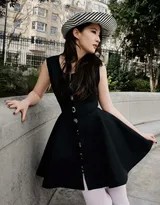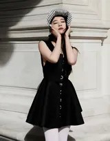 这身造型的妙处,在于细节处的碰撞与和谐。小黑裙上的每一颗纽扣都如同时尚勋章,闪烁着低调的光芒。而黑白条纹帽的加入,无疑是整个造型的点睛之笔,它打破了全黑的沉静,注入了一抹活泼的韵律感,让整体风格在优雅的基础上,平添了几分俏皮与不羁。刘亦菲以一抹性感红唇和风情万种的大波浪卷发来搭配,面对镜头时,她或自信凝视,或俏皮地抛出一个飞吻,瞬间将复古名伶的灵动与魅力展现得淋漓尽致。