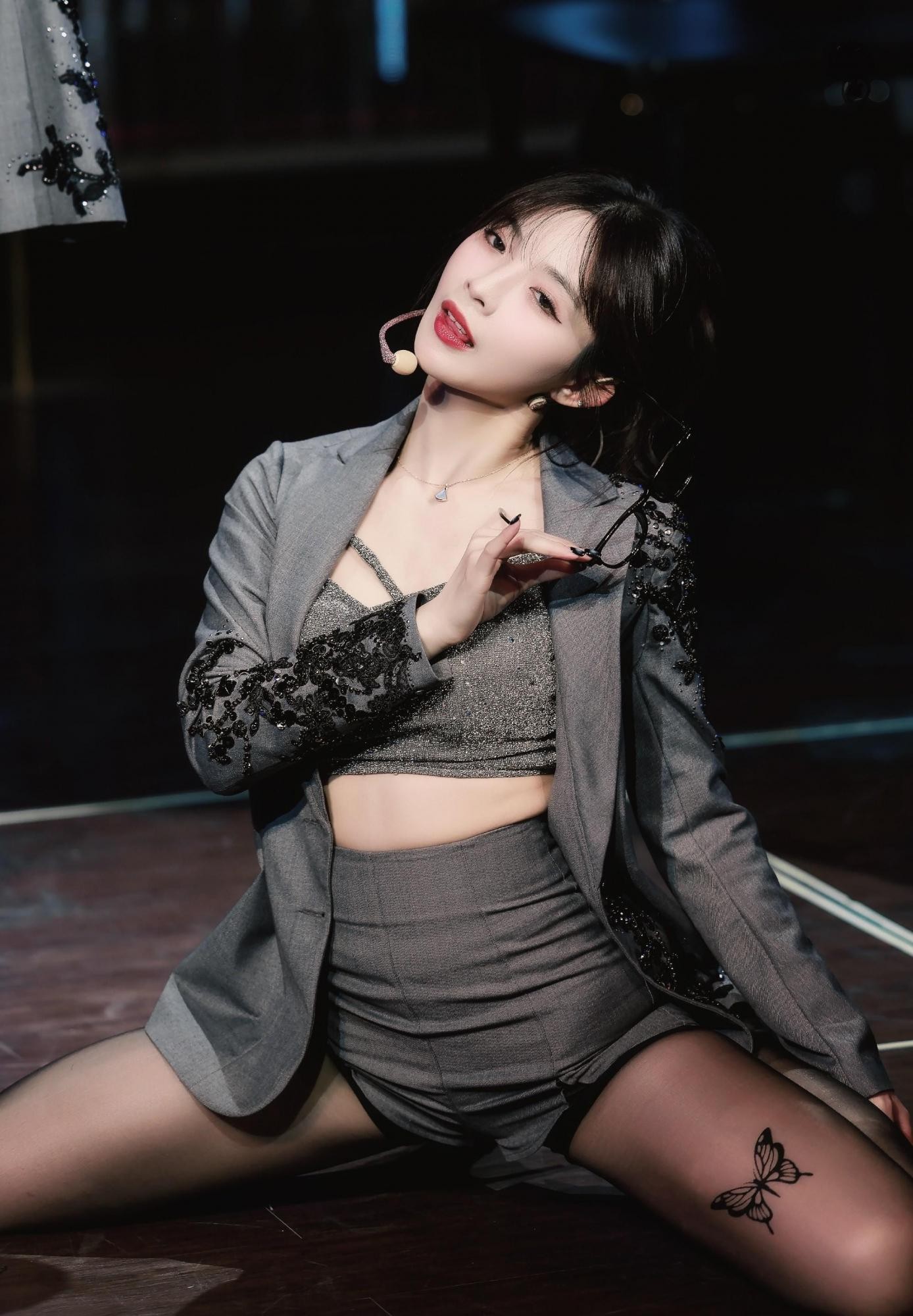 舞台的灯光设计也为这场表演增色不少。追光灯如同忠诚的伴侣,始终聚焦于她,在舞台上形成明亮与阴影的强烈对比,进一步凸显了她身体动作的戏剧性。冷暖色调的光束时而交织,时而分离,为她的黑丝袜与短裙造型蒙上了一层梦幻而高级的滤镜,让整个表演如同上演着一幕现代都市魅影。