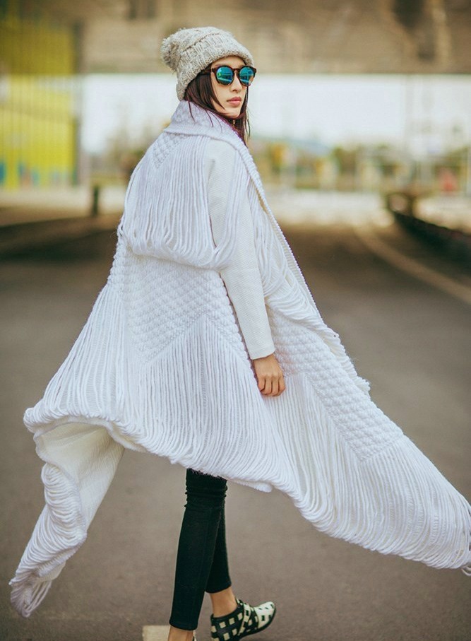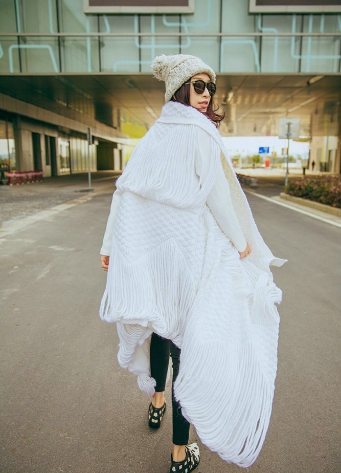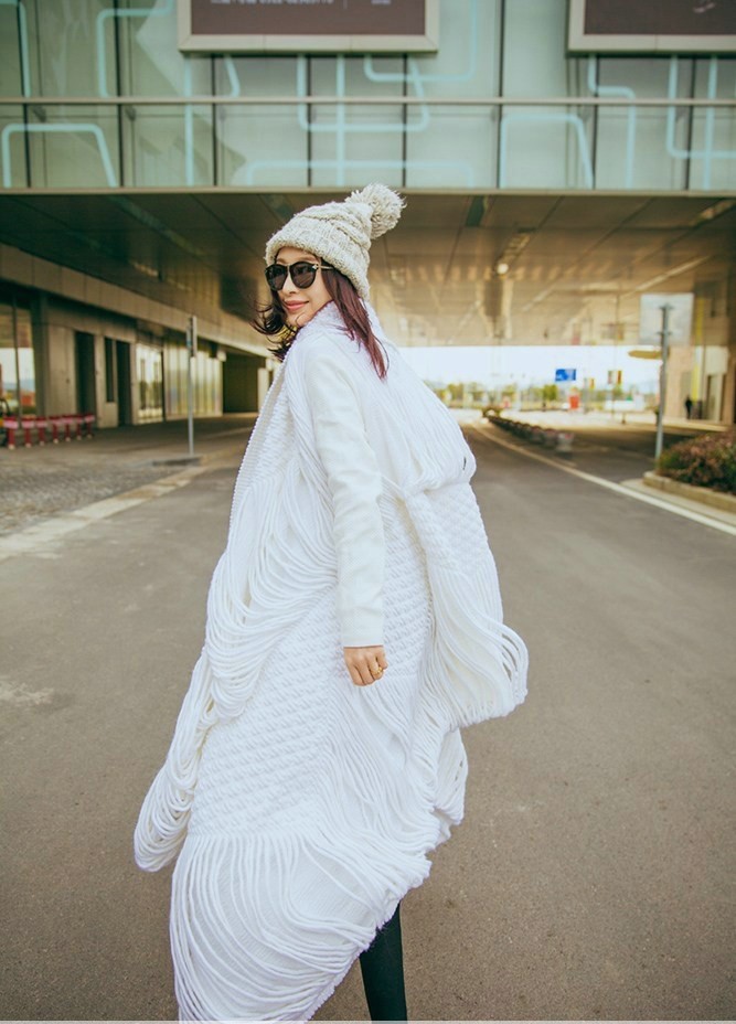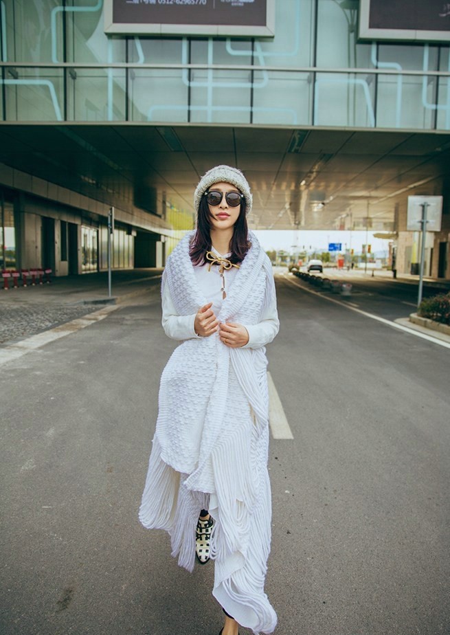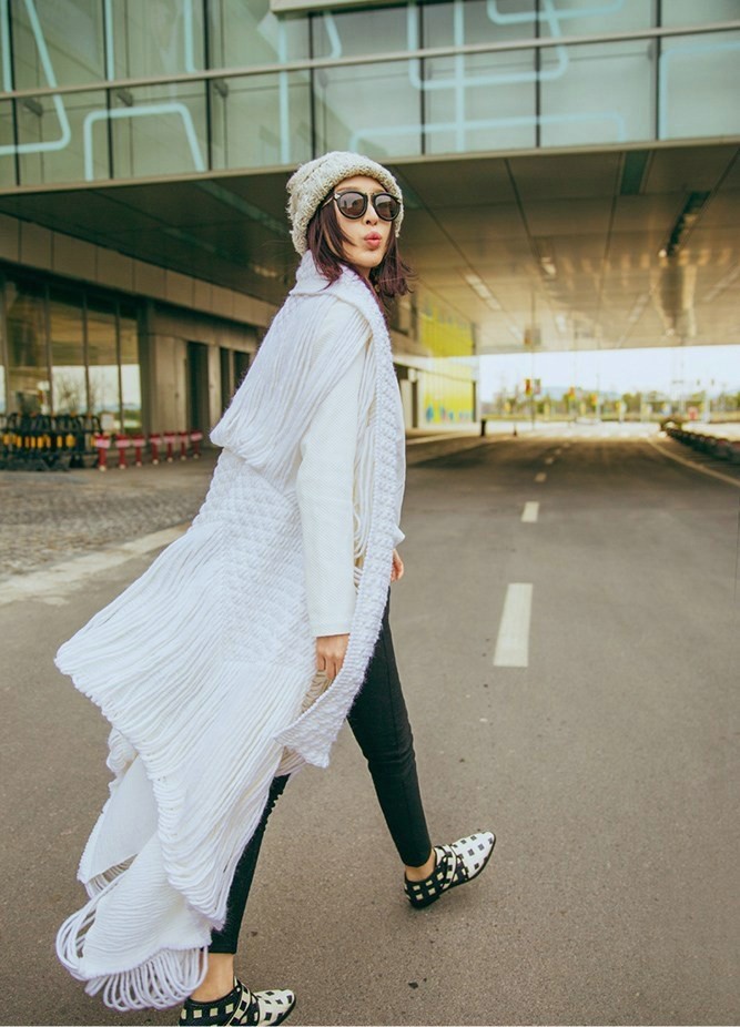 在这组街拍中,张俪选择了一件设计感十足的白色镂空长款毛衣作为核心单品。宽松的版型与精巧的镂空花纹结合,在随性中透露出细腻心思。温暖的白色毛线材质为初春时节带来一抹软糯的暖意,而独特的编织工艺则让整体造型避免了单调,显得个性鲜明。张俪凭借其出色的时尚驾驭能力,将这件毛衣轻松穿出了洒脱与优雅并存的气质。