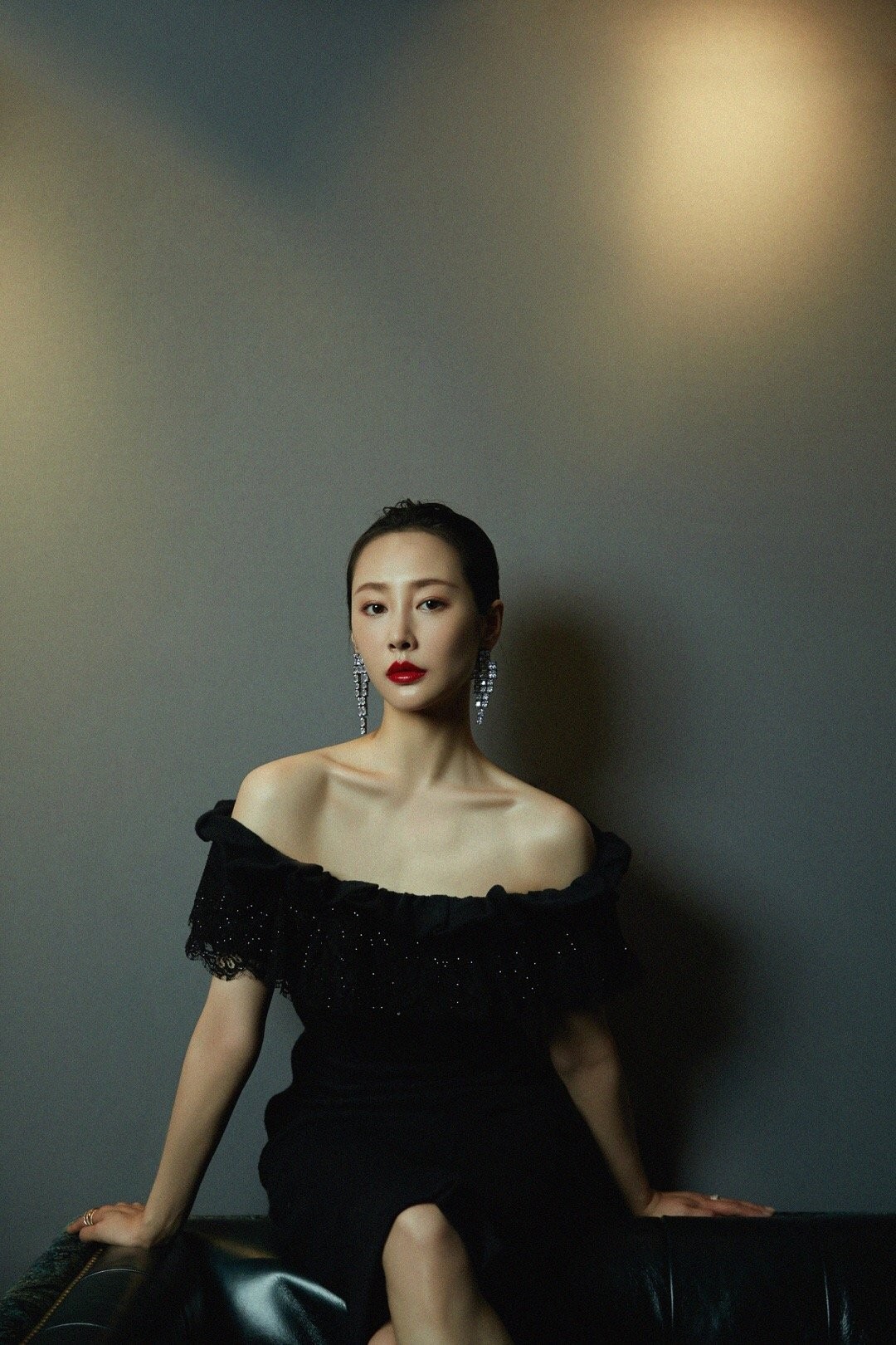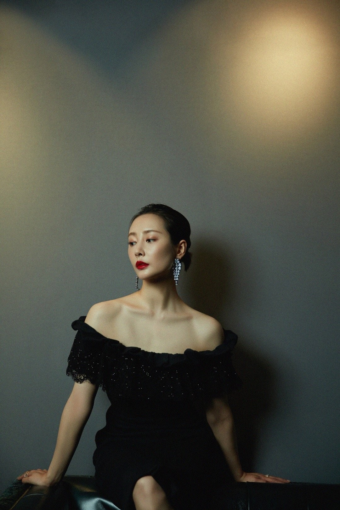 黑色,作为时尚界永恒的经典色,在这组大片中被赋予了多层次的表达。李纯身着一袭黑色抹胸长裙,丝绒材质在灯光下泛着柔和的光泽,与她白皙的肌肤形成鲜明对比,勾勒出优雅而性感的颈肩线条。她或静立凝视,或微侧脸庞,眼神沉静而富有故事感,展现出一种内敛的力量。